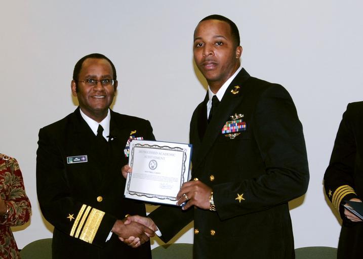 Keywords: Academic award 090209-N-YT478-044.jpg en Officer Candidate Tyrell Grant receives the Distinguished Academic Award from Vice Adm Mel Williams Jr commander of U S 2nd Fleet during an awards ceremony in celebration of Black History Month Grant formerly an active-duty Electronics Technician 1st Class received the award for having a grade point average of 3 81 for the Fall 2008 semester U S Navy photo by Mass Communication Specialist 1st Class Lolita M Lewis/Released 2009-02-09 Petty Officer 1st Class Lolita Lewis https //www dvidshub net/image/1269709 090209-N-YT478-044 2014-04-24 08 05 NORFOLK VA US PD-USGov-Military-Navy Black History Month Images from DoD uploaded by Fæ |