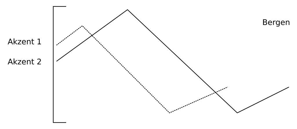 Keywords: Accent 1 and accent 2 in Bergen.de.svg Describes pitch height of accent 1 and accent 2 in bisyllabic words in Bergen Norway Helge Sandøy Talemål Novus Forlag Oslo 1993 ISBN 82-7099-206-2; p 126 2007-08-19 MaEr Norwegian language Phonetics