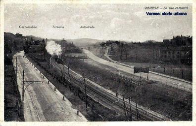 Keywords: A sinistra (ancora con fondo sterrato) la carrozzabile: l'odierna via Gasparotto con la linea tramviaria per Azzate (aperta nel 1911), al centro i binari delle Ferrovie dello Stato (in funzione dal 1865) e a destra l'autostrada per Milano (aperta nel 1924). varese