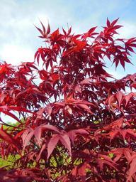 Keywords: acer palmatum japanese maples trees red red leaves blue sky blue white green garden