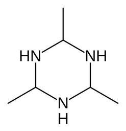 Keywords: Acetaldehyde ammonia trimer.svg Skeletal formula of acetaldehyde ammonia trimer hexahydro-2 4 6-trimethyl-1 3 5-triazine Created using http //www acdlabs com/download/chemsk html ACD/ChemSketch 10 0 and Inkscape Own 2007-02-26 Fvasconcellos Six-membered nitrogen heterocycles Saturated nitrogen heterocycles Trimers