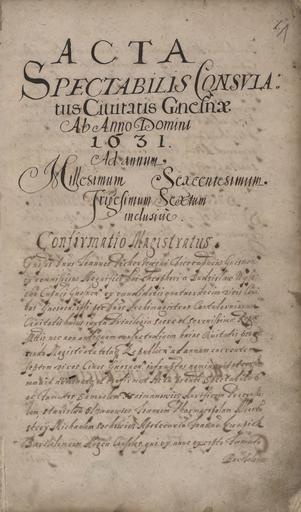 | Keywords: Acta spectabilis consulatus civitatis Gnesnae ab Anno Domini 1631.jpg pl Akta m Gniezna w zbiorach Archiwum Państwowego w Poznaniu Karta tytułowa księgi Acta spectabilis consulatus civitatis Gnesnae 1631-1636 Inducta Jednostka archiwalna 53/4058/0/-/I/33 http //szukajwarchiwach pl/53/4058/0/-/I_33 q Acta+spectabilis+consulatus+civitatis+Gnesnae wynik 1 rpp 15 page 1 tabJednostka http //www archivesportaleurope net/ead-display/-/ead/pl/aicode/PL-53/type/fa/id/PL-53-4058_SLASH_0/unitid/I_SLASH_33/search/0/Acta+spectabilis+consulatus+civitatis+Gnesnae en Acta spectabilis consulatus civitatis Gnesnae 1631-1636 Collection 53/4058/0 Akta miasta Gniezno » Series units without series » File/unit I/33 http //www wbc poznan pl/dlibra/docmetadata id 98502 from publication Miasto Gniezno 1631 see below Gniezno in the 1630s Polishsymbol PD-old-100 |