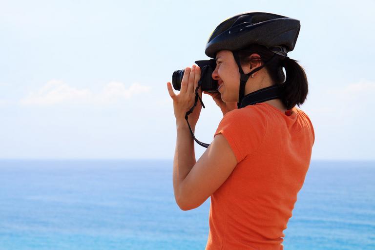 Keywords: action active activity blue cyclist helmet human leisure outdoor people person photographer sky sport summer young woman sea ocean water