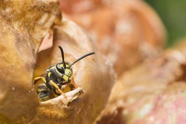 | Keywords: AD2009Sep09 Vespula germanica 04.jpg wasp found in much of Earth's Northern Hemisphere is the German wasp Vespula germanica It is native to Europe temperate Asia and northern Africa The specimen in the picture is a fully grown worker female with a length head to abdomen of about 14 mm It is leaving a fallen apple which was hollowed out by its colony within two days Between its mandibles it is carrying a piece of that apple quite likely for feeding purposes Own Bernie 2009-09-09 100 px 100 px 100 px 100 px 100 px 100 px 100 px 47 523265 12 300372 region AT Vespula germanica |