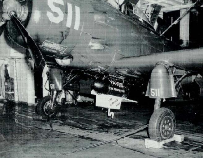 Keywords: AD-4 VA-195 KitchenSinkBomb Aug1952.jpg en A U S Navy Douglas AD-4 Skyraider of attack squadron VA-195 Dambusters with a special ordnance aboard the aircraft carrier USS Princeton CVA-37 in August 1952 VA-195 was assigned to Carrier Air Group 19 CVG-19 for a deployment to the Korean War from 21 March to 3 November 1952 The special weapon was a 454 kg 1000 lb bomb with a kitchen sink attached The idea came up when the squadron's executive officer LCdr M K Dennis remarked during a meeting with the press We dropped everything on them the North Koreans but a kitchen sink Royal J Deland ADC and J Burnett ADC then produced a bomb with a kitchen sink attached The commanding Admiral was not pleased by this and would not allow to drop the bomb for a week However press coverage in the United States obviously led to the dropping of this bomb in August 1952 on Pyongyang by Lt jg Carl B Austin http //138 147 50 20/a-korea/dec52-12 pdf USS Princeton website http //groups msn com/USSPrincetonCV37/photoalbum msnw action ShowPhoto PhotoID 168 U S Navy sailor or employee 1952-08 PD-USGov-Military-Navy AD-4 Skyraider Military aircraft in the Korean War Aboard USS Princeton CV-37 Strike Fighter Squadron 195 United States Navy |