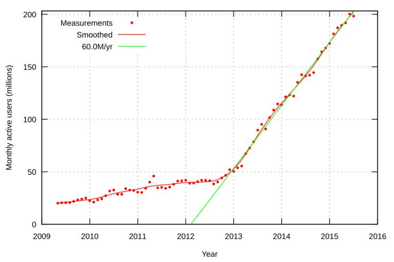 | Keywords: Adblocking growth according to pagefair.svg en This graph shows the changing usage of ad-blocking software in browsers over over time based on data from PageFair's 2015 report http //downloads pagefair com/reports/2015_report-the_cost_of_ad_blocking pdf The data plotted is the number of monthly active users which is estimated from a normalized download count of EasyList The usage is currently growing at a constant rate of 60 million users per year and has been doing so since 2013 2016-04-23 own Amaurea other versions cc-zero Information graphics Software Advertising |