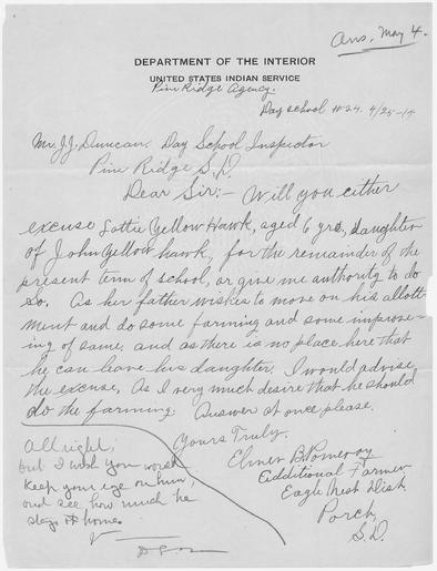 | Keywords: Additional Farmer Elmer B. Pomeroy, Eagle Nest District, Porch, South Dakota, to J.J. Duncan. - NARA - 284455.tif Scope and content General notes 284455 Local identifier Department of the Interior Office of Indian Affairs Pine Ridge Agency 1878 - 09/17/1947 NARA's Central Plains Region Kansas City NREA 400 West Pershing Road Kansas City MO 64108 1914-04-25 Record group Record Group 75 Records of the Bureau of Indian Affairs 1793 - 1999 Record group ARC 404 Correspondence of the Day School Inspector J J Duncan compiled 02/09/1910 - 09/06/1916 Series ARC 283922 File unit Correspondence of Day School Inspector J J Duncan January 4 1914 to September 30 1914 01/04/1914 - 09/30/1914 File unit ARC 284437 Variant control numbers NAIL Control Number NRE-75-169-G-18 yes Other versions NARA-cooperation PD-USGov Check categories-NARA 2011 September 16 Documents in English Manuscripts |
