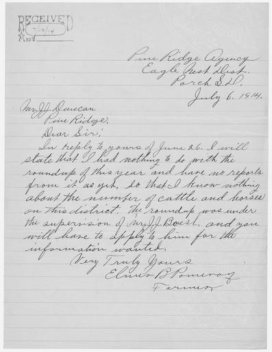 | Keywords: Additional Farmer Elmer B. Pomeroy, Eagle Nest District, Porch, South Dakota, to J.J. Duncan. - NARA - 284461.tif Scope and content General notes 284461 Local identifier Department of the Interior Office of Indian Affairs Pine Ridge Agency 1878 - 09/17/1947 NARA's Central Plains Region Kansas City NREA 400 West Pershing Road Kansas City MO 64108 1914-07-06 Record group Record Group 75 Records of the Bureau of Indian Affairs 1793 - 1999 Record group ARC 404 Correspondence of the Day School Inspector J J Duncan compiled 02/09/1910 - 09/06/1916 Series ARC 283922 File unit Correspondence of Day School Inspector J J Duncan January 4 1914 to September 30 1914 01/04/1914 - 09/30/1914 File unit ARC 284437 Variant control numbers NAIL Control Number NRE-75-169-G-24 yes Other versions NARA-cooperation PD-USGov Check categories-NARA 2011 September 16 Documents in English Manuscripts |