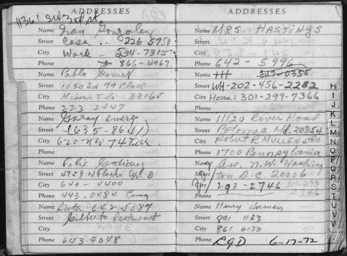 Keywords: Address Book of Watergate Burglar Bernard Barker, Discovered in a Room at the Watergate Hotel, June 18, 1972 - NARA - 304966.jpg Scope and content This address book lists HH initials for Howard Hunt a White House consultant After confirming that the telephone number listed here was indeed at the White House the FBI linked the Watergate break-in to the White House during the investigation's earliest hours General notes Exhibit History American Originals December 1997 - December 1998 National Archives Rotunda Washington DC Exhibit No 624 0217 Recent America June 1984 - December 1985 National Archives Rotunda Washington DC Exhibit No 533 0374 304966 Local identifier U S District Court for the District of Columbia 1936 - Special Access/FOIA Section Textual Archives Services Division NWCTF National Archives at College Park 8601 Adelphi Road College Park MD 20740-6001 Record group Record Group 21 Records of District Courts of the United States 1685 - 2004 Record group ARC 350 Watergate-Related Cases compiled 06/1972 - 1986 Series ARC 304963 File unit United States versus G Gordon Liddy Eugenio Martinez Frank Sturgis E Howard Hunt James McCord Bernard Barker and Virgilio Gonzalez 06/1972 - 1986 File unit ARC 304964 Variant control numbers NAIL Control Number NWCTF-21-USDISTCTDC-CRUSVLIDDY-GOVEX38<br /> NAIL Control Number NWDDA-21-USDISTCTDC-CR-USVLIDDY-GOVEX38<br /> Search Identifier siLearning Center<br /> Search Identifier siNational History Standard Era 10 Other versions <gallery> File Address_Book_of_Watergate_Burglar_Bernard_Barker _Discovered_in_a_Room_at_the_Watergate_Hotel _June_18 _1972_-_NARA_-_304966 tif tif File Address_Book_of_Watergate_Burglar_Bernard_Barker _Discovered_in_a_Room_at_the_Watergate_Hotel _June_18 _1972_-_NARA_-_304966 jpg jpg </gallery> NARA-cooperation PD-USGov Watergate scandal Documents in English Address books |