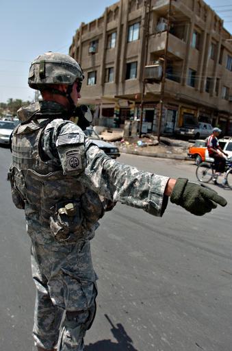 Keywords: Adhamiyah checkpoints DVIDS48809.jpg en Longwood Fla native Sgt David Smith 23 a field artilleryman with 1st Platoon Battery B 2nd Battalion 319th Airborne Field Artillery Regiment 2nd Brigade Combat Team 82nd Airborne Division directs traffic away from an impromptu vehicle check point on the streets south of the Fish Market of the Rabi neighborhood of Baghdad's Adhamiyah District June 28 The vehicle checkpoints came the day after a vehicle-borne improvised explosive device commonly referred to as a car bomb was detonated in the area killing one Iraqi policeman and wounding another two as well as two Iraqis 2007-06-28 Spc Leith Edgar https //www dvidshub net/image/48809 48809 2007-07-01 17 46 RABI IQ PD-USGov 82nd Airborne Division Images from DoD uploaded by Fæ |