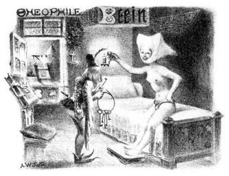 Keywords: Adolf-Willette pseudo-medieval chastity-belt trade-card Theophile-Bein.jpg Sketch for a humorous trade card combination advertisement and business card for one Théophile Belin whose first name is ornamentally spelled with a Greek letter Theta drawn by French caricaturist Adolphe Willette ca 1900 Probably the actual printed cards would have contained additional text otherwise it would be a visiting card there is no adress or profession marked This jocularly depicts a medieval young woman confined in a chastity belt though as a matter of historical fact the chastity belt was much more of a Renaissance phenomenon than medieval and also a highly-caricatured pseudo-medieval man with a ring of keys who has entered by climbing a ladder to the balcony outside her window The woman is drawn as quite cheerful despite wearing nothing but her voluminous hair-covering headdress and the chastity belt Scanned from an early 20th-century book edited by Eduard Fuchs probably Die Frau In Der Karikatur 1907 ~ 1900 creator Adolphe Willette PD-old-auto-1923 1926 Adolphe Willette Female chastity devices Trade cards Topless sitting women in art Satire Cartes d'adresse Visiting cards |