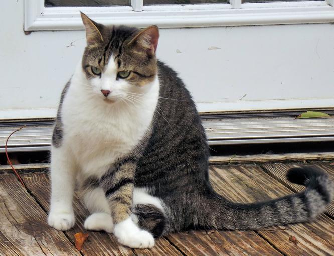 Keywords: adorable tabby tuxedo feline cat animal kitty pet white striped fur whiskers sitting