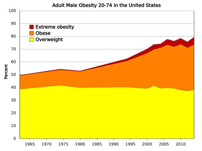 | Keywords: Adult male obesity in the United States.svg translate yes en Percent overweight in the United States of males including obese and extremely obese from 1962 to 2014 A relatively constant 40 declining slightly are overweight but the percent of normal weight has declined while obesity and extreme obesity have increased Data from http //www cdc gov/nchs/data/hestat/obesity_adult_13_14/obesity_adult_13_14 htm CDC 2016-07-22 own Delphi234 other versions cc-zero Obesity statistics for the United States |