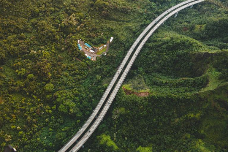 Keywords: aerial view highway landscape countryside road overpass elevated terrain infrastructure hills bypass travel rural