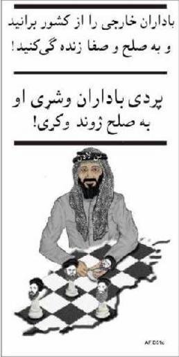 | Keywords: Afghan14back.jpg Afghanistan Leaflets AFD51c FRONT WHO REALLY RUNS THE TALIBAN BACK EXPEL THE FOREIGN RULERS AND LIVE IN PEACE The front of the leaflet depicts Mullah Mohammed Omar as a kuchi a dog of nomads chained at the heel of Osama bin Laden Tha back of the leaflet depicts Osama playing Chess with Taliban pawns on a game board map of Afghanistan This leaflet was almost rejected by approving authority until it was exlained that chess is immensely popular in the region and the image would instantly connect with the target audience http //www psywarrior com/afghanleaf14 html unknown author PD-USGov Taliban leaflets people of Afghanistan Osama bin Laden |