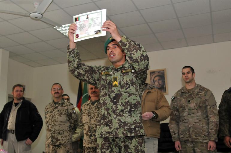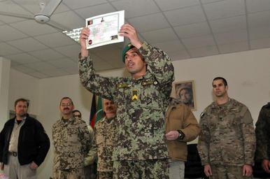 | Keywords: Afghan Forces graduate from IED-Defeat-EOD training 111215-N-CB888-006.jpg  en An Afghan National Army soldier proudly displays his certificate during a graduation ceremony held at the Afghan National Army Engineer School near Camp Spann Dec 15 Fifteen Afghan servicemen graduated in the ceremony and can now wear the Explosive Ordnance Disposal patch and badge after completing 22 weeks of intensive EOD and Improvised Explosive Device Defeat training The Engineer School is the only one in Afghanistan that teaches the fundamentals of EOD and IEDD to Afghan National Security Forces International Security Assistance Force Regional Command North supports Afghan National Security Forces in close coordination and collaboration in providing security and disrupting the insurgents' activities in order to protect the population secure the highways and support the Afghan Border Patrol operations in the border areas and crossing points in order to set the conditions for economic social and cultural development in key terrain districts 2011-12-15 Chief Petty Officer Oscar Troncoso https //www dvidshub net/image/501566 111215-N-CB888-006 2011-12-19 08 23 MAZAR-E-SHARIF AF PD-USGov-Military-Navy Soldiers of the Afghan National Army Images from DoD uploaded by Fæ |