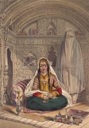 Keywords: Afghan lady in Kabul.jpg en Ladies Of Caubul This lithograph is taken from plate 24 of 'Afghaunistan' by Lieutenant James Rattray A political mission composed of Doctor Lord and Captain Rattray James' brother was established at Bamiyan This was the frontier city of Afghanistan and the first spot which could be attained by the Russians It was also the only road by which the exiled Dost Mohammed could revisit his kingdom The region was famed for its Buddhist statues Shakar Lab 'Sugar Lips' was the favourite wife of a former governor of Bamiyan and niece by marriage to Dost Mohammed As a great favour Rattray was introduced to her at Kabul Describing her as a Qizilbash belle of the first water Rattray wrote Afghaun ladies exercise more control over their husbands than is usual in Eastern countries Though women of the higher classes were strictly under purdah as in Hindustan Rattray wrote that they certainly enjoyed life more than the Hindustanis Women were seen making constant pleasure excursions into tombs gardens and bazaars and they threw off their veils and restraint in secluded spots He had sometimes come upon them thus and found them strikingly handsome fa بانوان کابل این نقاشی از صفحهٔ ۲۴ «افغانستان» اثر ستوان جیمز راترای گرفته شده است کاپیتان راترای برادر جیمز و دکتر لرد در بامیان مأموریتی سیاسی داشتند این شهر شهری مرزی بود و نخستین شهری بود که می توانست به دست روس ها بیفتد همچنین تنها جاده ای بود که دوست محمد تبعیدشده می توانست از طریق آن به قلمرواش سر بزند این منطقه به خاطر مجسمهٔ بودا مشهور بود شکرلب زن مورد علاقهٔ حاکم سابق بامیان و خواهرزادهٔ دوست محمد بود که در کابل راترای را به او معرفی کردند راترای که وی را از قزلباشان توصیف می کند می نویسد «بانوان افغان بیشتر از آنچه در شرق رایج است بر شوهران خود سلطه دارند » گرچه زنان طبقه های عالی تر همچون هندوستان شدیداً در پرده حجاب محصور هستند، راترای می نویسد آن ها بیشتر از زنان هند از زندگی بهره می برند بسیار دیده می شود که برای تفریح در آرامگاه ها، باغ ها و بازارها رفت وآمد می کنند و پوشش و حجاب خود را در خلوت برمی دارند وی که چهرهٔ برخی از ایشان را دیده بود آن ها را بسیار زیبا توصیف می کند British Library image http //www bl uk/onlinegallery/onlineex/apac/other/019xzz000000562u00024000 html Institution British Library or 1839 1842 Lieutenant James Rattray PD-Old PD-old-70 1840s lithographs Burqa Depictions of natives in European works Front views of women in art Lithographs of people Paintings of sitting women at full length People of Kabul Women of Afghanistan in art 19th-century people of Afghanistan