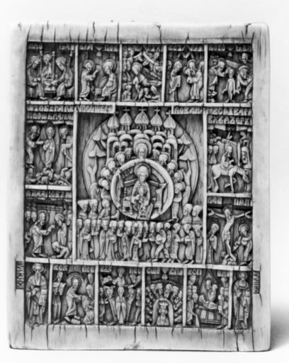 | Keywords: Afonasii Isakov - "In Thee Rejoices," Feast Scenes, and Saints - Walters 71261.jpg The central scene of this ivory represents the composition In Thee Rejoiceth based on a liturgical hymn that exhorts all of creation to sing praises to the Virgin Mary is shown enthroned in Paradise holding her son Jesus and surrounded by angels Below the faithful are offering her their praise The image is framed by scenes corresponding to the twelve major feasts of the Orthodox Church the Holy Trinity represented as the three angels that appeared to Abraham at Mamre Annunciation Nativity Presentation of Christ in the Temple Baptism Transfiguration Entry into Jerusalem Raising of Lazarus Crucifixion Resurrection Ascension Pentecost and Dormition Death of the Virgin Saints Basil and Gregory are depicted in the lower left and right corners On the back are Saints Nicholas Athanasius and Sergius of Radonezh ; Saint George killing the dragon; Prophet Isaiah Saint Ambrose Saints Stephen and Nicetas; Saints Catherine Barbara and Parascheve Small panels of the present kind were used as personal prayer images and this one carries in the lower frame the name of its original owner Athanasius Isaacovich Olgov century 17 Early Modern ivory cm 7 5 6 1 accession number 71 261 7922 Henry Walters city Baltimore Walters Art Museum Henry Walters Acquired by Henry Walters 1931 Translation on the face In thee rejoiceth O Full of Joy all creation on the back in the lower frame Belongs to Athanasius son of Isaac Olgov A Millennium of Christianity Russian Art from The Walters Art Gallery The Walters Art Gallery Baltimore 1988-1989 place of origin Russia Walters Art Museum license Russian art in the Walters Art Museum Carved ivory objects Virgin Mary Eastern Orthodoxy Holy Trinity Reliefs of Christian saints in Russia Media contributed by the Walters Art Museum needs artist review Reliefs of angels |