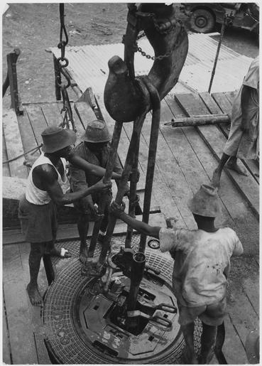 Keywords: Africa. Gabon, French Equatorial Africa. Native workers assemble drill pipes, the rotary table comes from Beaumont... - NARA - 541653.tif Scope and content General notes 541653 Local identifier 286-ME-1 22 U S International Development Cooperation Agency Agency for International Development 10/01/1979 - ca 1998 Most Recent <br /> Department of State International Cooperation Administration 06/30/1955 - 11/1961 Predecessor <br /> Foreign Operations Administration 08/01/1953 - 06/30/1955 Predecessor <br /> Economic Cooperation Administration 1948 - 12/30/1951 Predecessor <br /> Mutual Security Agency 1951 - 08/01/1953 Predecessor NARA-Author Rodger George Photographer 2236828 <br /> Still Picture Records Section Special Media Archives Services Division NWCS-S National Archives at College Park 8601 Adelphi Road College Park MD 20740-6001 circa 1948 1955 Record group Record Group 286 Records of the Agency for International Development 1948 - 2003 Record group ARC 608 Photographs of Marshall Plan Activities in Europe and Africa compiled ca 1948 - ca 1989 documenting the period 1945 - ca 1954 Series ARC 541631 File unit File unit ARC Variant control numbers NAIL Control Number NWDNS-286-ME-1 22 yes Other versions NARA-cooperation PD-USGov Oil drilling rigs Hooks Men at work People of Cameroon Marshall Plan George Rodger United States Agency for International Development Economy of Gabon Gabon in the 1950s |