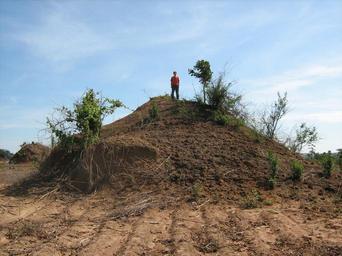 Keywords: africa giant ant hill unusual sky clouds nature outside boy standing on top