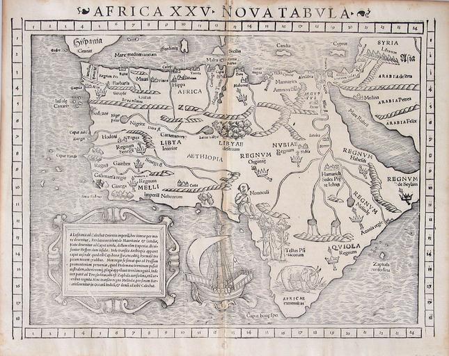 Keywords: AFRICA XXV NOVA TABULA.jpg First map to show the entire continent of Africa <br>Uncolored <br>257 x 345 mm <br>Appeared in Munster's edition of Claudius Ptolemy's Geographia in 1540 http //www betzmaps com/AF-550 html 1552 Creator Sebastian Münster Public Domain PD-old-100 1550s maps of Africa 1552 1552 maps Sebastian Münster Pseudo-Ptolemaic regions |