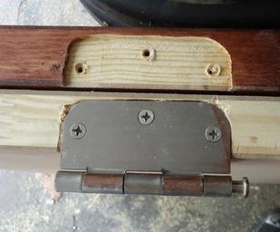 Keywords: After using a butt marker to chisel out hole for door hinge.JPG en When installing a new interior door often it is necessary to remove wood so the metal hinge can fit snugly against the side of the door The broken door above with the hinge removed shows what the end result should look like The best way to make a similar hole is to use a butt marker to outline where the hinge should go then shave off the wood to the right depth approximately 1/8 inch using a Dremel or chisel then drill three holes for the hinge screw then attach the hinge the lower door 2014-05-20 own Tomwsulcer cc-zero Uploaded with UploadWizard Handyman photos by tom sulcer Hinges in the United States Woodworking