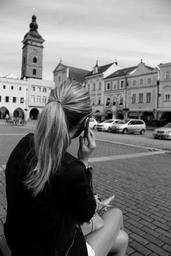 Keywords: afternoon czech budejovice square black tower black and white character weekday bohemia
