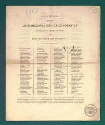 Keywords: AGAD (11) Lista czÅ‚onków Zjednoczonej Emigracji Polskiej, PudÅ‚o 663, s. 123.png Lista imienna czÅ‚onków Zjednoczonej Emigracji Polskiej sporzÄ…dzona i ogÅ‚oszona przez Komitet Emigracji Polskiej na podstawie list przesÅ‚anych przez Komitet Tymczasowy i KomisjÄ™ TymczasowÄ… <br/> Stosunek ugrupowaÅ„ politycznych Wielkiej Emigracji do wydarzeÅ„ w Królestwie Polskim poprzedzajÄ…cych wybuch powstania styczniowego nie ograniczaÅ‚ siÄ™ tylko do rozstrzÄ…sania i oceniania ich na Å‚amach prasy wychodźczej Podejmowano równolegle wysiÅ‚ki organizacyjne które miaÅ‚y przygotować emigracjÄ™ do wypeÅ‚nienia przez niÄ… sÅ‚użebnych zadaÅ„ wobec kraju zwÅ‚aszcza gdy wybuchnie walka zbrojna SzÅ‚y one w trzech kierunkach “ zjednoczenia wychodźstwa dla zwiÄ™kszenia efektywnoÅ›ci jego dziaÅ‚aÅ„ na rzecz kraju rekonstrukcji i rozwiniÄ™cia sÅ‚użb majÄ…cych ewentualnie peÅ‚nić obowiÄ…zki polskiego aparatu dyplomatycznego a po części i propagandowego w stosunkach z innymi narodami i rzÄ…dami oraz przygotowania szkolenia militarnego Dążenie do zjednoczenia polskiej emigracji na Zachodzie najsilniej objawiÅ‚o siÄ™ wÅ›ród starych emigrantów Pod koniec 1861 r podjÄ™to próby przeprowadzenia wyborów i wybrania wspólnego komitetu Sekcja londyÅ„ska Towarzystwa Demokratycznego Polskiego dalej TDP wystosowaÅ‚a pod datÄ… 18 VIII 1861 r odezwÄ™ do czÅ‚onków w której apelowaÅ‚a o aktywizowanie siÄ™ i zakÅ‚adanie sekcji Szybko zareagowaÅ‚a na to też Komisja Korespondencyjna TDP w Paryżu bÄ™dÄ…ca organem poÅ›redniczÄ…cym miÄ™dzy CentralizacjÄ… londyÅ„skÄ… a czÅ‚onkami Towarzystwa rozproszonymi we Francji OddelegowaÅ‚a do Paryża Ludwika Bulewskiego w celu porozumienia siÄ™ z emigracjÄ… wysuwajÄ…c jako pÅ‚aszczyznÄ™ do zjednoczenia zasady demokratyczne 29 XII 1861 r ukonstytuowaÅ‚ siÄ™ Komitet Tymczasowy w oÅ›mioosobowym skÅ‚adzie Jego przewodniczÄ…cym zostaÅ‚ Jan Ledóchowski sekretarzem Leon Zienkowicz a skarbnikiem Adolf Chrystowski PoczÄ…tkowo należeli do niego m in Jan Nepomucen Janowski Seweryn Elżanowski Jan CzyÅ„ski Edmund Chojecki Do formujÄ…cego siÄ™ žZjednoczenia Emigracji mógÅ‚ należeć każdy wygnaniec który podzielaÅ‚ zasady manifestu poitierskiego TDP z 1836 r manifestu krakowskiego z 1846 r oraz aktów z 1848 r Komitet Tymczasowy okolicznoÅ›ci swojego powstania cele i zadania sformuÅ‚owaÅ‚ w odezwie ogÅ‚oszonej 12 I 1862 r 16 lutego wezwaÅ‚ czÅ‚onków do gÅ‚osowania na dziewiÄ™cioosobowy Komitet StaÅ‚y Na 674 osób które uznaÅ‚o odezwÄ™ ze stycznia za swój dokument ideowy 650 wzięło udziaÅ‚ w wyborach NajpoważniejszÄ… konkurencjÄ… dla inicjatywy TDP staÅ‚a siÄ™ grupa osób zwiÄ…zanych ze szkołą polskÄ… na Batignolles w Paryżu Byli to najczęściej ludzie nie zwiÄ…zani bezpoÅ›rednio ze stronnictwami emigracyjnymi o poglÄ…dach najczęściej umiarkowanie demokratycznych co nie przeszkadzaÅ‚o niektórym pozostać w kontaktach z Hotelem Lambert Nie widzieli żadnych przeszkód w różnicach poglÄ…dów jako że nowa forma rzÄ…dów i przyszÅ‚e urzÄ…dzenie spoÅ‚eczne miaÅ‚y być wg nich ustanowione przez caÅ‚y naród po odzyskaniu niepodlegÅ‚oÅ›ci Uważali ze należy łączyć siÄ™ nie z osobami ani stronnictwami ale pod hasÅ‚em wolnoÅ›ci dla kraju Utworzyli KomisjÄ™ TymczasowÄ… JednoczÄ…cej siÄ™ Emigracji pod przewodnictwem Leona Czachowskiego Leona Mazurkiewicza sekretarza i Rufina Piotrowskiego skarbnika SporzÄ…dzona w koÅ„cu 1860 r lista zjednoczonych liczyÅ‚a 381 nazwisk z tego 187 osób z Wielkiej Brytanii 178 z Francji i Algierii i 15 z Genui 22 VII 1862 r w Paryżu doszÅ‚o do porozumienia Komitetu Tymczasowego z KomisjÄ… TymczasowÄ… W drodze kompromisu wybrano dziewiÄ™cioosobowy Komitet Emigracji Polskiej Przewodniczyć mieli kolejno wszyscy czÅ‚onkowie Należeli do niego m in Stefan Bobrowski Józef Wysocki Seweryn Elżanowski Antoni Å»abicki Adolf Chrystowski Jan Ledóchowski Komitet ogÅ‚osiÅ‚ kilka odezw do emigracji w których przedstawiÅ‚ swoje demokratyczne zasady spoÅ‚eczno-polityczne a także zamiar przegÅ‚osowania przez wychodźstwo projektu zorganizowania siÄ™ emigracji i podatku braterskiego PostanowiÅ‚ wydawać swój organ prasowy- žGÅ‚os Wolny Nie rozwinÄ…Å‚ szerszej dziaÅ‚alnoÅ›ci nie tylko dlatego że byÅ‚ zlepkiem dwóch ugrupowaÅ„ o różnych programach ale głównie z braku pomocy materialnej Nie zyskaÅ‚ poparcia ani w kraju ani za granicÄ… 10 VII 1863 r zaprzestaÅ‚ dziaÅ‚ać przekazujÄ…c swoje papiery i przewiezionÄ… z Wersalu bibliotekÄ™ TDP pod opiekÄ™ dyrekcji szkoÅ‚y polskiej na Batignolles w Paryżu Prezentowany tu dokument to lista imienna czÅ‚onków Zjednoczonej Emigracji Polskiej Nie jest ona kompletna a z powodu nieczytelnych podpisów i błędnego podania nazwiska uważano jÄ… za materiaÅ‚ pomocniczy do ogÅ‚oszenia dokÅ‚adnej listy imiennej emigracji polskiej Lista zwolenników Komitetu obejmuje 1400 nazwisk a wiÄ™c wiÄ™kszość aktywnych jeszcze emigrantów zwÅ‚aszcza ze starej emigracji NajwiÄ™cej ich zamieszkiwaÅ‚o Paryż i okolice Londyn wraz z Portsmouth i AlgieriÄ™ Lista zostaÅ‚a wydrukowana i wydana w Paryżu w drukarni L Martineta <br /> Miejsce Paryż<br /> Data stworzenia grudzieÅ„ 1862<br /> Data publikacji 12 stycznia 1863<br /> Opis zewnÄ™trzny druk kopia j polski karty papierowe o wymiarach 221x265 mm ss 8<br /> Autor komentarza MaÅ‚gorzata Osiecka 1863-01-12 Archiwum Główne Akt Dawnych Biblioteka Polska w Paryżu RzÄ…d Narodowy powstania 1863-1864 Archiwum Izby Obrachunkowej sygn 663 s 123-130 author PD-old January Uprising documents Media contr