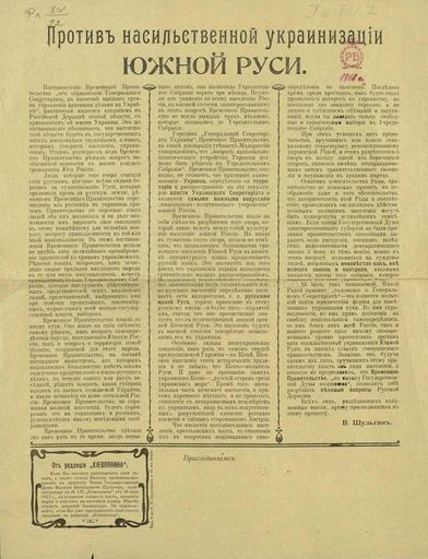 | Keywords: Against ukrainisation by Vasily Shulgin.jpeg ru «П отив насильственной ук аинизации Южной Руси» п отест члена Госуда ственной думы Василия Витальевича Шульгина в газете «Киевлянин» 1917 http //leb nlr ru/edoc/441074/ author Custom license marker 2014 08 08 PD-RusEmpire Uploaded with UploadWizard Vasily Shulgin Kievlyanin newspaper Ukrainization |