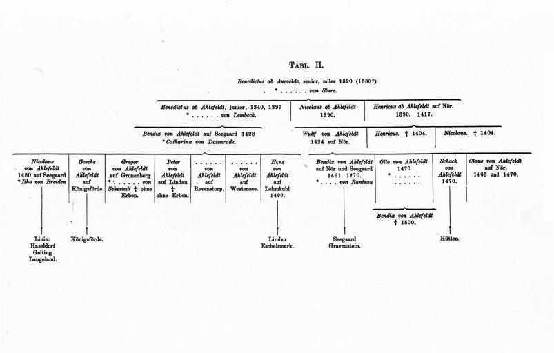 Keywords: Ahlefeldt Stammtafel 02.jpg de Stammtalfel der Adelsfamilie von Ahlefeldt aus dem Jahr 1869 Scan aus dem Buch Die Schleswig-Holsteinische Ritterschaft aus dem Jahr 1869 L von Ahlefeldt und W A von Rumohr 1869 PD-old Family trees of Ahlefeldt family |