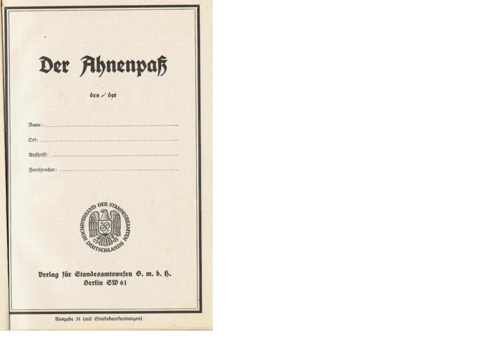 Keywords: Ahnenpass 002 anonym.png de excerpts from an Aryan certificate by the Reichsverband der Standesbeamten Deutschlands RDSD Union of Registrars of the Reich in Germany 31st Edition with death certificates by Verlag für Standesamtswesen G m b H Berlin SW 61 2014-05-24 00 00 46 own Dudy001 cc-zero Uploaded with UploadWizard Documents associated with the Nazi Holocaust National Socialism |