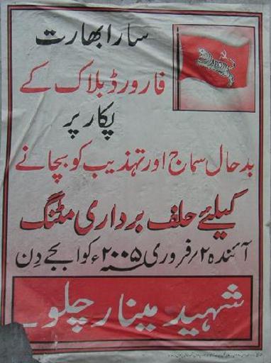 Keywords: Aifbposterkolkataurdu-2005.jpg All India Forward Bloc poster in Kolkata Calls for people to participate in a march to Shahid Minar on February 2 2005 Language Urdu Photo Soman The text reads To the whole of India - to protect the reeling society and culture come to the oath taking meeting on February 2 2005 at 1 p m near Shahid Minar 2006-10-05 own assumed Soman All India Forward Bloc Political posters of India Small images Posters of West Bengal |