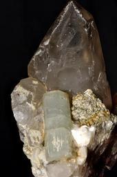 Keywords: Aigue-marine sur quartz fumé (Pakistan) .jpg fr Cristal d' aigue-marine sur cristaux de quartz fumé own Parent Géry 11/01/10 Aquamarine on smoky quartz Taken with Nikon D90