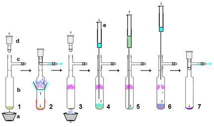 | Keywords: Air-free sublimation.png Air-free sublimation <U>Apparatus</U> a Rubber cone typically used to form a vacuum seal in a Büchner flask filtration which is selected so as to fit snugly around the neck of the Schlenk tube b Schlenk tube c Gas/vacuum inlet d Teflon tap or stopcock e Syringe <u>Method steps</u> 1 Impure solid to sublime brown is placed in a Schlenk tube avoiding contaminating the sides of the tube e g by careful evaporation from a solution containing the brown solid 2 Rubber cone black is pushed near top of the Schlenk tube forming a tight seal around flask and filled with a coolant such as dry ice/acetone blue/white to cool the neck of the Schlenk tube The bottom of the Schlenk tube is heated red shading under vacuum blue arrow so that the impure solid brown sublimes as a pure solid purple at the cooled neck area blue shading 3 After sublimation the cooling-cone black is removed leaving the concentrated impurity as a residue dark brown in the bottom of the flask and the purified sublimed solid purple at the neck of the Schlenk tube 4 Solvent blue is inserted via syringe to dissolve the residue green/brown taking care to avoid washing off the sublimed solid purple 5 Residue solution is then removed by syringe green/brown Steps 4 and 5 can be repeated as required 6 Purified sublimed solid purple is washed off the neck of the flask with fresh solvent blue via a syringe In steps 3 to 6 the flask is held under an atmosphere of an inert gas via Schlenk tube side arm 7 Solvent is removed under vacuum to give the purified sublimed solid dark purple Steps 6 and 7 are not essential Own Quantockgoblin Schlenk flasks Sublimation |