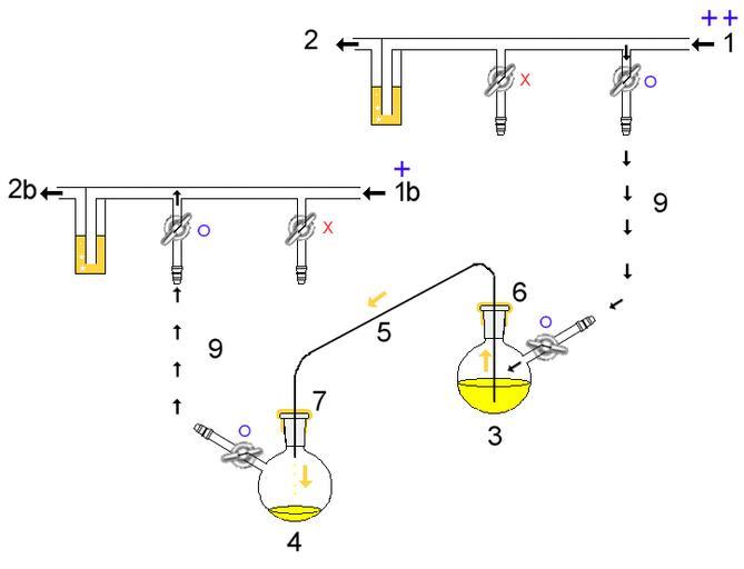 | Keywords: Air sensitive cannula - two manifold system.png Air sensitive cannula - two manifold system 1 Pressure in gas in 1b Pressure in gas in ; second manifold where the pressure in 1>1b 2 Pressure out oil bubbler orange 2b Pressure out oil bubbler orange ; second manifold 3 Higher flask with transfer liquid yellow to transfer 4 Lower receiving flask/transfered liquid yellow 5 Liquid transfer cannula 6 Septum orange on transfer flask 7 Septum orange on receiving flask 8 Pressure-control regulator/stopcock 9 Tubing/ gas-line not shown for clarity arrows show connectivity <font color blue>O</font> Open stopcock; <font color red>X</font> Closed stopcock; black-arrow Gas flow direction orange arrow Liquid flow direction <br> Note As the pressure is higher in the top-shown manifold the pressure will be higher in flask 3 containing the fluid to be transferred Own Quantockgoblin chemistry Cannula transfer Manifolds |