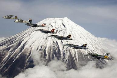 Keywords: Aircraft assigned Carrier Air Wing Five CVW-5 perform formation flight Mount Fuji Japan aircraft