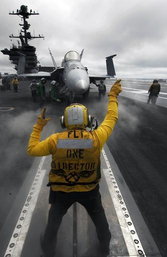 Keywords: aircraft carrier jet fighter flight chief deck ship sea ocean water military us navy sky clouds outside