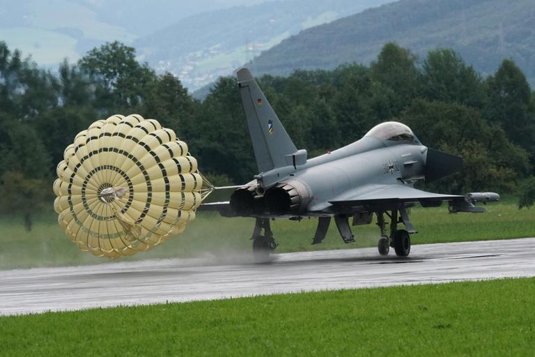 Keywords: aircraft fighter jet fighter aircraft eurofighter double engine defense air force landing brake screen air show mollis switzerland