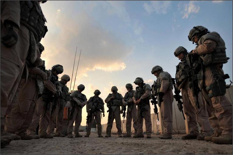 | Keywords: Airmen Conduct Police Transition Team Operations in Baghdad DVIDS127375.jpg  en U S Airmen assigned to Detachment 3 732nd Expeditionary Security Forces Squadron currently assigned to the 716th Military Police Battalion 18th Military Police Brigade Multi-National Division - Baghdad group together for a prayer Nov 4 2008 at Forward Operating Base Falcon The prayer is a tradition for the Airmen prior to heading out on their daily police transition team missions in the Abu T'shir area of Baghdad where they partner with their Iraqi police counterparts 2008-11-04 Petty Officer 2nd Class Todd Frantom https //www dvidshub net/image/127375 127375 2008-11-10 11 50 BAGHDAD IQ PD-USGov Forward Operating Base Falcon Images from DoD uploaded by Fæ |