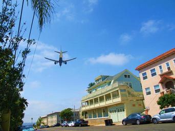 Keywords: airplane plane sky aircraft travel landing flight air in the air blue buildings san diego california coming in