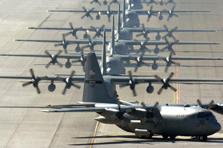 Keywords: airplanes line runway military planes transport turboprops propellers aviation flight c-130 elephant walk wait takeoff hercules