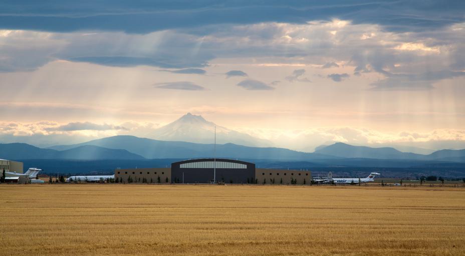 Keywords: airport landscape planes hangar mountains rays of light sunlight clouds atmospheric travel transportation airplane aviation scenic