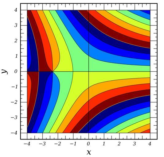 | Keywords: AiryAi Arg Contour.svg A graph of the argument of the Airy Ai function over the complex plane <br> <math>f x \mathrm arg \left \mathrm Ai x + iy \right \ </math><br> Both x and y run from -4 to 4 self-made Inkscape Mathematica 06/03/2008 Inductiveload Mathematica Code <pre><nowiki> conts ContourPlot ArgAiryAix + I y x -4 4 y -4 4 ContourShading -> False Contours -> 9 Frame -> False PlotPoints -> 100 </nowiki></pre> Airy function with complex arguments | ||||