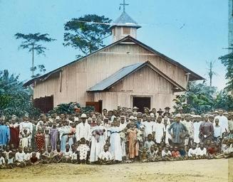 Keywords: Akaniobio Church, Old Calabar, Calabar, Nigeria, ca. 1900-1910 (IMP-CSWC47-LS9-60).jpg en <br> Akaniobio Church Old Calabar Calabar Nigeria ca 1900-1910 Tinted lantern slide showing the church at Akaniobio in Old Calabar and its large congregation of men women and children Some individuals wear European dress whilst others wear traditional Calabar styles A church was originally built in 1905 by Onoyom Iya Nya a wealthy trader who became a Christian under the work of Mary Mitchell Slessor 1848-1915 However the original church was flooded in 1906 Onoyam Iya Nya built a new church as the centre of a new settlement on higher ground naming the area Obio Usiere or Town of the Dawn It is unclear which church is represented in this image This slide comes from a set on mission culture and industry in Calabar southeast Nigeria generated by the Church of Scotland and the United Free Church of Scotland which was incorporated with the Church of Scotland in 1929 Photographer Unknown Filename IMP-CSWC47-LS9-60 tif Coverage date 1900/1910 Subject unesco Church Part of collection International Mission Photography Archive ca 1860-ca 1960 Part of subcollection Photographs from the Centre for the Study of World Christianity University of Edinburgh U K ca 1900-ca 1940s Repository name Centre for the Study of World Christianity Archival file Volume5/IMP-CSWC47-LS9-60 tif Geographic subject city or populated place Calabar Repository address The University of Edinburgh School of Divinity New College Mound Place Edinburgh EH1 2LX United Kingdom Geographic subject country Nigeria Format aacr2 lantern slides 8 2 x 8 2cm Geographic subject continent Africa Rights Contact the repository for details Part of series Church of Scotland Slide and Visual Collection Calabar Church and Industry CSWC47-LS9 Repository email divinity-CSWC ed ac uk Date created 1900/1910 Publisher of the digital version University of Southern California Libraries Subject aat genre exterior views Format aat lantern slides; photographs Geographic subject state Cross River Access conditions http //www ed ac uk/schools-departments/divinity/research/centres/world-christianity/collections-resources Geographic subject religious facilities File CSWC47/LS9/60 Subject lcsh Church; Presbyterian church 1900/1910 date created author http //digitallibrary usc edu/cdm/ref/collection/p15799coll123/id/78497 PD-old-70-1923 Magic lantern images Images from USC Digital Library uploaded by Fæ International Mission Photography Archive ca 1860-ca 1960 People of Calabar |