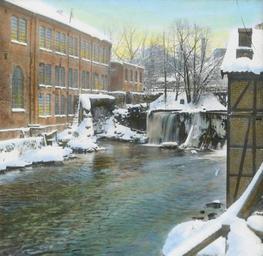 Keywords: papir papirmøller industri fabrikkbygninger elver fosser oslo norway nor outdoor Håndkolorert dias. Bentse Bruk ved Akerselva, Norges første tresliperi, som kom i drift i 1863. I boken " Norsk landskap og norske menn" forteller Wilse: "På min videre ferd nådde jeg fram til Bentse Bruk ved Akerselven. Jeg så straks fra broen at her måtte det være noen gode motiver å forevige, og derfor fant jeg meg også en nedgang gjennom gjerdet og nedover skråningen. Jo, her var det motiver, en stille flytende elv med gjenspeiling av røde fabrikkbygninger, mens skinnende snø og blålige iskanter dannet en vakker og malerisk ramme om det mørke vannet. Hurtigst mulig ut med apparatet, for dagene er korte i januar på disse breddegrader. Men det varte heller ikke lenge før fine motiver vandret ned i vesken. Da så jeg at det noe nedenfor meg sto en høy herre i ulveskinnspels og malte. Og det var ingen ringere enn Norges store maler Fritz Thaulow. [...] Da sa Thaulow: - Kunne De gjøre meg den tjenesten å fotografere disse strømhvirvlene som De ser her i elven?" Håndkolorert dias. Bentse Bruk ved Akerselva, Norges første tresliperi, som kom i drift i 1863. I boken " Norsk landskap og norske menn" forteller Wilse: "På min videre ferd nådde jeg fram til Bentse Bruk ved Akerselven. Jeg så straks fra broen at her måtte det være noen gode motiver å forevige, og derfor fant jeg meg også en nedgang gjennom gjerdet og nedover skråningen. Jo, her var det motiver, en stille flytende elv med gjenspeiling av røde fabrikkbygninger, mens skinnende snø og blålige iskanter dannet en vakker og malerisk ramme om det mørke vannet. Hurtigst mulig ut med apparatet, for dagene er korte i januar på disse breddegrader. Men det varte heller ikke lenge før fine motiver vandret ned i vesken. Da så jeg at det noe nedenfor meg sto en høy herre i ulveskinnspels og malte. Og det var ingen ringere enn Norges store maler Fritz Thaulow. [...] Da sa Thaulow: - Kunne De gjøre meg den tjenesten å fotografere disse strømhvirvlene som De ser her i elven?" |