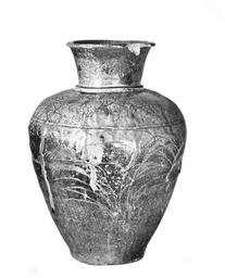 Keywords: Akikusamon bottle.JPG en Pot with design of autumn grasses Akikusamon bottle unknown Discovered in the Hakusan Burial Mound; mouth bending slightly outward bulging upper body narrow base; covered with green glaze and drawings of autumn grasses Japanese silver grass melon scratched in with a spatula; character 上 in the inside of the mouth Heian period second half of 12th century Funerary pot; Atsumi ware; height 42 cm 17 in diameter at neck 16 cm 6 3 in diameter at body 29 cm 11 in diameter at base 14 cm 5 5 in Keio UniversityKeio University Tokyo; ja 秋草紋壺 平安時代 渥美窯 慶 大学 蔵 Pictures of Japan Cultural Properties 1st Volume Tokyo Association of Cultural Properties 1954-05-10 PD-Japan-oldphoto National Treasures of Japan crafts Atsumi ware |