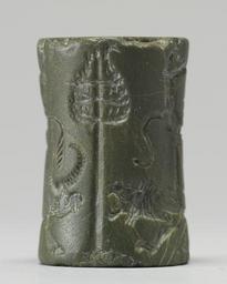 Keywords: Akkadian - Cylinder Seal with King or God and Vanquished Lion - Walters 42674 - Side D.jpg The scene on this seal features a central motif of a tree On one side a bearded hero is holding an inverted bovid; on the other a bull man is holding an inverted lion There are cuneiform inscriptions running through the scene in two places La escena en este sello muestra un adorno central de un árbol Por un lado un héroe barbudo esta sujetando un bóvido invertido por el otro lado un hombre toro esta sujetando un león invertido Hay inscripciones cuneiformes a lo largo de la escena en dos áreas date Old Akkadian green stone cm 2 1 accession number 42 674 4594 Sadie Jones Mrs Henry Walters New York date and mode of acquisition unknown Sale Joseph Brummer New York 1941 Walters Art Museum 1941 by purchase Museum purchase 1941 Inscription place of origin Egypt Walters Art Museum license Akkadian cylinder seals Cylinder seals in the Walters Art Museum Bulls in art Animals in art of the ancient Near East Trees in art of the ancient Near East Walters cylinder seal 42674 Cuneiform on cylinder seals Walters Art Museum cylinder seals with cuneiform Media contributed by the Walters Art Museum needs category review |
