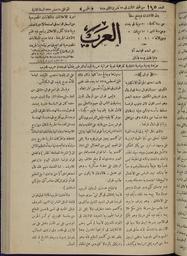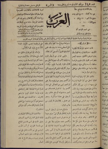 | Keywords: Al-Arab, Volume 3, Number 145, November 21, 1918 WDL12647.jpg  Artwork ru Анистас  а и аль-Ка мили 1866 1947 fr Anistās Mārī al-Karmilī ab 1866-1947 en Anistās Mārī al-Karmilī ab 1866-1947 zh 阿尼斯塔斯·玛里·卡尔密里,1866-1947 年 pt Anistās Mārī al-Karmilī ab 1866 a 1947 ar أنستاس ماري، الكرملي، الأب، 1866-1947 es Anistās Mārī al-Karmilī ab 1866-1947 ru Аль-А аб том 3 145 21 нояб я 1918 года fr Al-Arab volume 3 n° 145 21 novembre 1918 en Al-Arab Volume 3 Number 145 November 21 1918 zh  阿拉伯人报 ,第 3 卷,第 145  ,1918 年 11   21 日 pt Al-Arab Volume 3 Número 145 21 de novembro de 1918 ar العرب، المجلد الثالث، العدد 145، 21 نوفمبر 1918 ru Газета <em> Аль-А аб </em> А абы впе вые вышла в Багдаде 4 июля 1917 года спустя п име но четы е месяца после того как б итанские войска отвоевали го од у ту ок тем самым освободив его от т ехвекового господства Османской импе ии Газета появилась в пе еломный пе иод в исто ии И ака Она выпускалась б итанскими властями и служила  упо ом б итанской админист ации на фоне поднимающейся волны и акского и а абского национализма В ней османские ту ки п едставлялись иноземцами а б итанцы  освободителями и п едп инимались попытки  асши ить влияние б итанской военной и политической ст атегии нап авленной п отив Османской импе ии в Пе вой ми овой войне И название и печатаемые на пе вой ст анице выходные данные в кото ых газета называлась а абской по своей сути и целям уч ежденной в Багдаде а абами и для а абов и публикуемые в газете мате иал  все в газете было нап авлено на фо ми ование об аза местного издания отстаивающего инте есы а абского населения В пе едовице пе вого номе а ту ки были названы сыновьями Гога и  агога желающими ист ебить а абов  этот доб ый на од кото ый в п ошлом внес неоценимый вклад в дело п иумножения знания и п ог есса ми ного сосуществования и гуманизма   ате иалы издания были посвящены таким темам как политика новости исто ия и лите ату а Редакто ом газеты был ученый и богослов Анистас аль-Ка мили и акский х истианин ливанского п оисхождения  Поначалу газета Аль-А аб выходила каждые два дня но начиная с 28-го номе а стала публиковаться ежедневно к оме воск есенья Вначале она состояла из двух ст аниц пе иодически дополнявшихся п иложениями но начиная с 1 янва я 1918 года стала печататься на четы ех ст аницах В мае 1920 года она пе естала издаваться и ее заменила газета Аль-И ак И ак пе вый номе кото ой увидел свет 1 июня 1920 года <br>Экономические условия; Лите ату а; Политика и уп авление fr Le journal <em>Al-Arab</em> parut pour la première fois à Bagdad le 4 juillet 1917 quatre mois environ après la prise de la ville jusque-là sous la domination des Turcs par les troupes britanniques mettant fin à trois siècles d'emprise ottomane Le journal créé à une période critique de l'histoire de l'Irak était publié par les autorités britanniques et leur servait de porte-parole alors que le nationalisme irakien et arabe était en pleine ascension Dépeignant les Ottomans comme des étrangers et les Britanniques comme des libérateurs le journal avait pour objectif de développer la stratégie politique et militaire britannique contre les Ottomans pendant la Première Guerre mondiale Le titre l'ours qui déclarait que le journal fut « établi avec des principes et des objectifs arabes à Bagdad par des Arabes pour les Arabes » et le contenu visaient à souligner son caractère local et son allégeance arabe Un éditorial paru dans le premier numéro décrit les Turcs comme des « fils de Gog et Magog cherchant à annihiler les Arabes ce grand peuple qui œuvra autrefois de façon mémorable en faveur du savoir du progrès de la cohabitation et de l'humanité  » Le journal abordait des sujets tels que la politique l'actualité l'histoire et la littérature Irakien chrétien d'origine libanaise le théologien et érudit Anistās al-Karmilī en était l'éditeur <em>Al-Arab</em> paraissait initialement tous les deux jours puis à partir du numéro 28 il fut publié tous les jours sauf le dimanche Le quotidien comportait d'abord 2 pages et parfois des suppléments mais il passa à 4 pages le 1<sup>er</sup> janvier 1918 Il cessa d'exister en mai 1920 Il fut remplacé par le journal <em>Al-Irak</em> dont le premier numéro parut le 1<sup>er</sup> juin 1920 <br>Conjoncture économique; Littérature; Politique et gouvernement en The newspaper<em> Al-Arab</em> The Ar