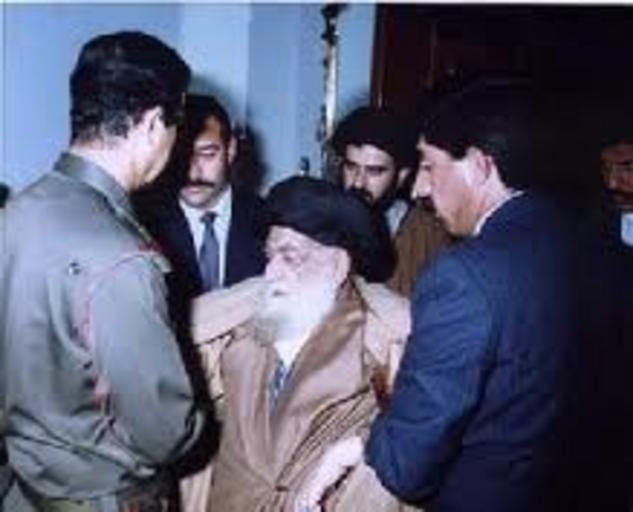 | Keywords: Al-khoi-saddam.jpg en Ayatollah al-Khoei forced to visiting Saddam Hossein after fault riot of al-Dawa political party in 1974 fa دیدار اجباری آیت الله خویی با صدام حسین پس از شکست انتفاضه شعبانیه در سال ۱۹۷۴ 1974 http //www alkhoei net/english/pages/gallery php img 52 موسسه الخویی الاسلامیه PD-Iraq Uploaded with UploadWizard Abu al-Qasim al-Khoei |