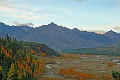 Keywords: alaska wilderness glacier bed landscape river bed mountains rocky scenery nature forest trees autumn natural